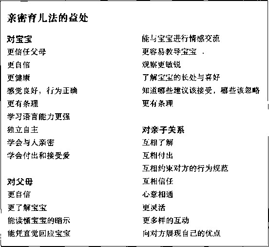 为。接受亲密育儿法的宝宝很少哭,也很少发生肠痉挛,很少烦躁不安,很少发脾气,他们也不会感到无聊或黏着人不放。理由很简单:宝宝心情好,表现就好。宝宝因为自己的暗示都得到了解读和回应而感到被尊重,从而也会对回应他的人产生信任感。宝宝发自内心地感到满足,所以不需要哭闹。