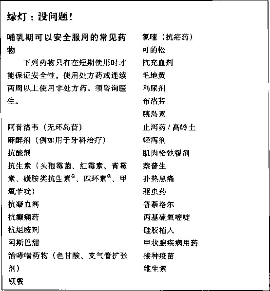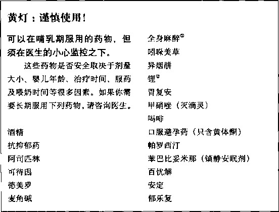 但令人担心的是,当这些婴儿长大成人生儿育女时,是否会产生影响?由于这项研究目前还没有得出定论,所以在服用避孕药之前,请咨询你的医生。(见第145页对母乳喂养和避孕的讨论。)抗抑郁和其他精神类药物。这类药应谨慎使用。这类药或多或少都会进人母乳中,而目前几乎没有这种药对婴儿影响的确切结论。
