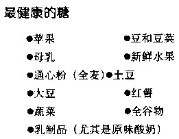 一个名字,叫“甜蜜的废物”,因为其中几乎所有的天然维生素和矿物质都被提纯排除了。因此,它们也被称做“虚卡路里”。不要让宝宝沉迷于这些甜蜜的废物,它们一点好处都没有,只会让宝宝一上一下地坐过山车。(见第237页“膳食纤维和碳水化合物一健康伴侣”。)较好的糖果糖,尤其是水果中的糖,是比较好的。这些糖不仅味道甜,而且比上面说的玉米糖浆和白糖要好,因为它们不会造成激素像过山车一样高低起伏。吃一个橘子后造成的激素变化以及随之而来的行为变化,不如吃糖果后的变化来得剧烈。乳糖的表现也要好些,因为它们不像精炼糖那样会快速进人血液。果糖和乳糖都是跟其他的许多营养素一起进人肠道的,所以进人血液的速度不会那么快。