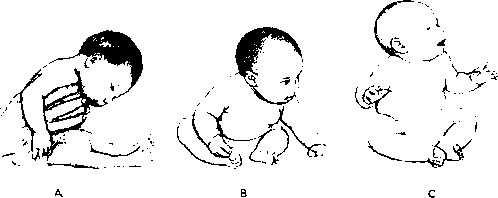 注意看宝宝是怎么学会平衡的。他先放开一只手,然后是另一只手,.1:身保持45度前倾。随着平衡能力和背部肌肉的加强,他能做到和地面成90度(下图C)。初学坐的宝宝常常会摇摇晃晃,还会不时把手臂伸出来,好像在玩平衡木。