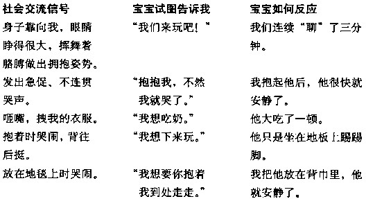 下面这个练习让你学会理解宝宝早期的信号。把你最喜欢的社会交流信号列在第一栏,把你对这些信号的理解列于第二栏,把宝宝的反应列在第三栏。经过几个月的练习之后,你的观察能力会大有长进。例如: