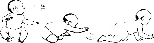 宝宝把一项静止的技能(坐)发展到运动的技能(身体向前探),这就是宝宝学会爬的前奏。把玩具放在一个他够不着的地方,你会看到他身子使劲地往前探,胳膊往前伸,最终拿到玩具。他学会将双腿弯曲朝里,安全提示让宝宝练习身体往前探的动作时,要选择一个柔软的玩具,以防头部碰到玩具上。如果是木头、金属、塑料制成的玩具,碰到头是很不舒服的。这种向内的姿势使他能够以脚为基点向前倾。当身体往前探时,力量在积聚,最终使得身体前探的力量逐渐战胜小屁股的重量,于是身体往前扑倒,通常是肚子撑在地上,这样就缩短了与目标的距离。