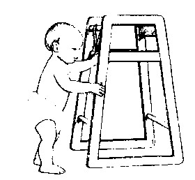 在楼梯上面装一个安全门,对宝宝来说就像在公牛面前摇动红旗一样。冲动的小探险家会攀着门站起来,把门前后摇动,有时甚至会连人带门从楼梯上滚下去。到底是要装门,还是教宝宝如何安全地爬下楼梯,都取决于宝宝的性格和爬行能力。观察你的宝宝如何爬到最上层的台阶。10~11个月时,大部分婴儿都会对高度产生戒备(见第526页)。有些宝宝爬到边缘时会停下来,看一看,摸一摸。这样的宝宝,就可以训练学习安全地爬下楼梯。然而,性格冲动的宝宝,不会减慢速度和用手触摸边缘,他们下台阶时很可能会摔下来。这些宝宝和那挫运动能力,爬行技巧进步神速的宝宝都需要大人小心监督,装一扇稳固的安全门。