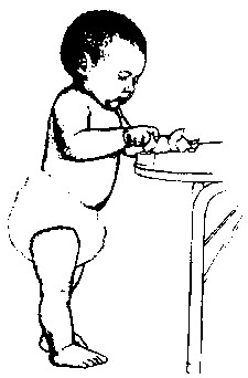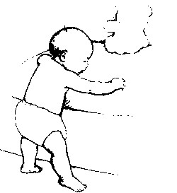 —旦宝宝学会攀着家具站起,他就会喜欢上这项新技能,享受新视野,于是发展了在有支撑的情况下站着的能力。然而当他试图把摇摇晃晃的脚放平时,他会一下子失去平衡。要等到宝宝学会像芭莆舞女那样站着,脚放平朝外时,他的平衡才会好一点。