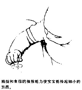 缩在手掌里。很快,拇指也跟上食指的步伐,宝宝就能用拇指和食指夹到东西。随着夹取能力的成熟,宝宝很快就可以用拇指和食指的指尖合作来夹东西,你会看到宝宝用手掌抓东西的动作减少了,直接用手指夹取的动作变多了。