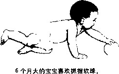 到6个月左右,宝宝接触并抓取物体时更多地用单手,更有目的性,也更有力度。现在宝宝能很快地抓住递给他的玩具。宝宝坐着时,放一个玩具在他面前,他能稳当而准确地接触到目标。现在你试着把玩具拿走,这时宝宝会抗议,会牢牢地抓住玩具不放。你好不容易把玩具从他手里抽出来,重新放在他面前,这时你会看到他立即扑过去,把玩具抓在手里。
