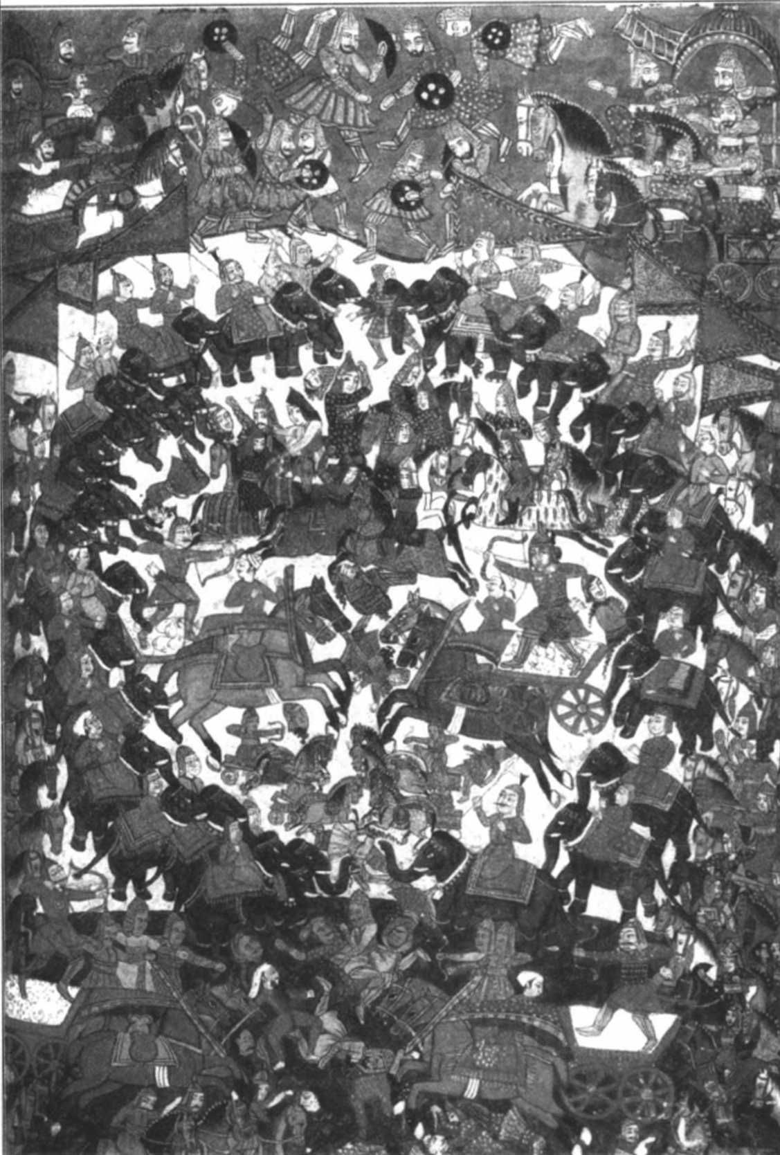 《摩诃婆罗多》主要内容是般度族的五兄弟与他们的堂兄弟俱卢族之间的战争。此图描绘的是俱卢族军队正在进攻阿周那的儿子阿比马纽的军队。