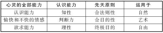 就一般心灵能力而言,只要把它们当做高层能力,亦即包含着一种自律的能力来看待,那么,对于认识能力(对自然的理论认识能力)来说,知性就是包含着建构性的先天原则的能力;对于愉快和不快的情感来说,这种能力就是判断力,它不依赖于能够与欲求能力的规定相关,并由此直接是实践的那些概念和感觉;对于欲求能力来说则是理性,它无须任何一种不论从哪里来的愉快的中介而是实践的,并作为高层的能力为欲求能力规定终极目的,这个终极目的同时带有对客体的纯粹的理智愉悦。———判断力关于自然的一种合目的性的概念还是属于自然概念的,但只是作为认识能力的范导性原则,尽管引起该概念的关于某些对象(自然的对象或者艺术的对象)的审美判断,就愉快或者不快的情感而言,是一个建构性的原则。各种认识能力的协调一致包含着愉快的根据,这些认识能力的游戏中的自发性使得上述概念适用于作自然概念的领域与自由概念在其后果中联结的中介,因为这种联结同时促进了心灵对道德情感的感受性。———下表可以有助于按照其系统的统一性来概观一切高层的能力(有人曾对我在纯粹哲学中的划分结果几乎总是三分的而感到疑虑。但这却在于事物的本性。如果一种划分应当先天地进行,那么,它将要么按照矛盾律是分析的;而在这里它任何时候都是二分的(quodlibet ens est aut A aut non A[任何一个存在者都要么是A,要么是非A])。要么它就是综合的;而如果它在这一场合应当从先天概念出发(而不是像在数学中那样从先天地与概念相应的直观出发) 来进行,那么,按照一般综合统一所要求的东西,亦即(1)条件,(2)一个有条件者,(3)从有条件者与它的条件的结合中产生的概念,划分就必须是三元体。)。
