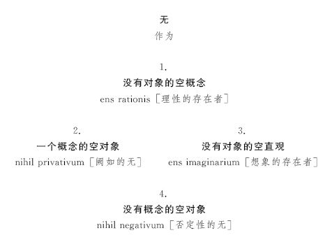 可以看到,思想物(第1)与非物(第4)被区别开来,乃是由于前者不可被列入可能性之中,因为它只不过是虚构(尽管不是自相矛盾的虚构)罢了,而后者则是与可能性对立的,因为该概念甚至取消自身。但二者都是空概念。与此相反,nihil privativum[阙如的无](第2)和ens imaginarium[想象的存在者](第3)都是概念的空材料。如果光不被给予感官,人们就不能表现黑暗,而如果没有广延的存在物被知觉到,人们就不能表现空间。无论是否定性,还是直观的纯然形式,没有一种实在的东西就都不是客体。