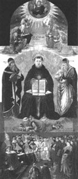 《圣托马斯·阿奎那的荣耀》(意大利,贝诺佐·戈佐利绘,1471年)。此图的最上面是耶稣基督,在耶稣基督的下面是基督教的先知。再下面是托马斯·阿奎那,在他的左右分别是亚里士多德与柏拉图,地面上躺着一个阿拉伯哲学家。在下面则是教皇在向众教士讲经。通过这幅画表现了阿奎那在基督教哲学中承上启下的伟大作用