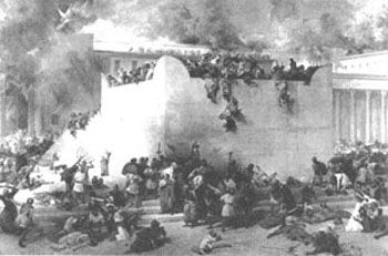 《罗马军队围攻耶路撒冷》(意大利,弗朗西斯科·海耶兹绘,1867年)。公元66年,以色列地区发生饥荒之后,犹太人发动了一场针对罗马帝国的起义,史称“第一次犹太罗马战争”。在罗马军队的围攻下,耶路撒冷陷落,起义失败了。战胜的罗马人,破坏了耶路撒冷城,只留下了圣殿的一部分的基础,也就是今天的西墙;还将犹太人的标志“犹太灯台”运回了罗马