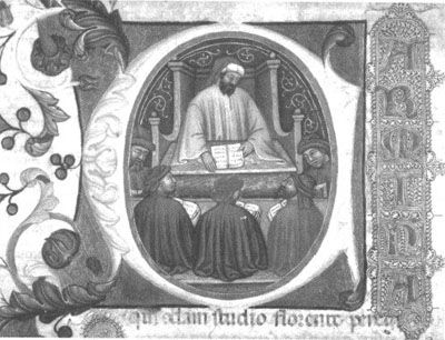 正在教授哲学的波伊提乌古。罗马晚期的政治家、哲学家、作家,曾任东哥特王国的执政官。其哲学糅合了基督教神学、柏拉图主义、新柏拉图主义、亚里士多德等学说