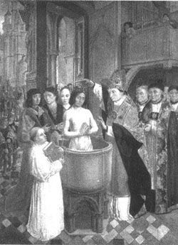 教皇为克洛维举行洗礼。公元496年,法兰克王国国王克洛维在妻子的劝说下,放弃信奉阿里乌教派,皈依基督教。教皇圣雷米吉乌斯亲自为他主持洗礼仪式