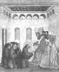 教皇英诺森三世批准方济各会设立并祝福其创建者圣弗朗西斯及其追随者。英诺森三世(1160—1216年)担任罗马教皇期间,大力拓展罗马教廷的权力,使教廷的权势达到顶峰,并积极参与欧洲各国的政治斗争,曾迫使迫使英国、丹麦、葡萄牙、瑞士等国称臣