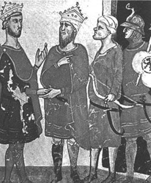 腓特烈二世会见埃及苏丹。神圣罗马帝国皇帝腓特烈二世的幼年时代是在教皇英诺森三世的庇护下长大的,并在其帮助下登上了帝位。而腓特烈二世也组织了第四次十字军东征作为回报,在这次东征中他避免任何战场上的交锋,通过谈判收复了耶路撒冷,并重建了耶路撒冷王国,自任国王。教皇英诺森三世死后,腓特烈二世与继任教皇的关系迅速僵化,屡次发生冲突