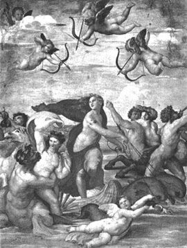 拉斐尔作品《嘉拉提亚的凯旋》。拉斐尔是意大利文艺复兴时期著名的画家,其作品将基督教与异教统统融合在一起,创造出和谐、秀丽的场面