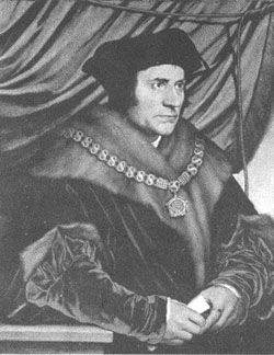 托马斯·莫尔(1478—1535年)。英国空想主义者,著有《乌托邦》一书,在此书中他虚设了一个理想中的社会:在那里,财产是公有的,人民是平等的,实行着按需分配的原则,大家穿统一的工作服,在公共餐厅就餐,官吏由秘密投票产生