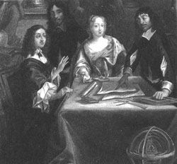 笛卡尔(图左)向瑞典女王克里斯蒂娜讲解哲学。1649年,笛卡尔受瑞典女王克里斯蒂娜之邀前往斯德哥尔摩,然而北欧严寒的气候笛卡尔很不适应,不幸染上了肺炎,并于1650年2月在斯德哥尔摩去世
