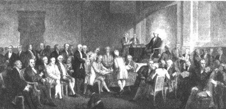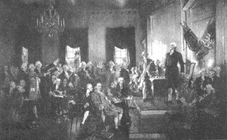 美国宪法草案签署时的场景。美国独立战争取得胜利后,1787年各州代表来到费城讨论修订邦联条约,制定宪法。同年宪法草案制定完成,第二年六月新罕布什尔州同意宪法草案,从而达到法定的宪法生效条件——13个州中9个州同意,宪法正式生效。这部宪法第一次将洛克的三权分立学说付诸于政治实践,从而奠定了今天美国三权分立的政治格局