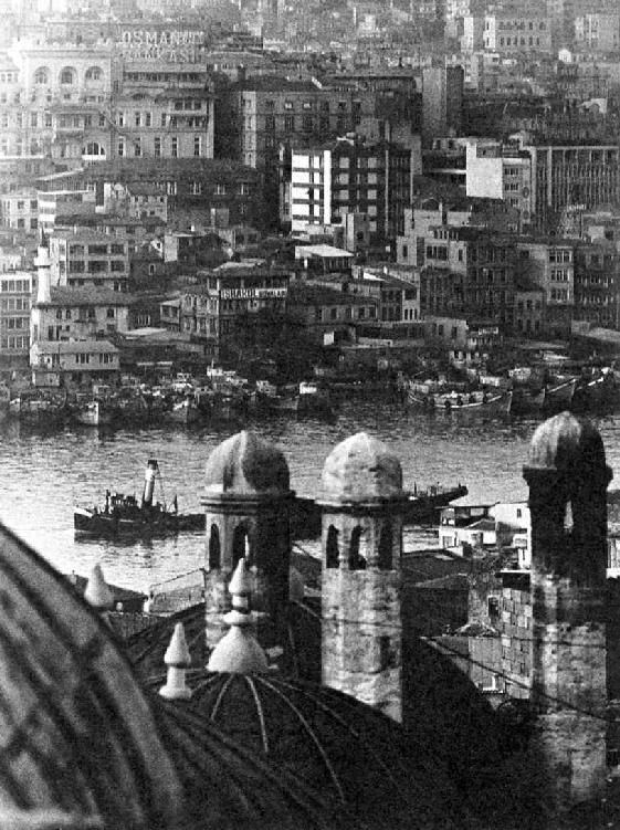 透过甲板后方抖动的窗户,我望着金角湾的码头缓缓流过,被古伊斯坦布尔时代的木造房屋覆盖的山丘,以及种满柏树的墓园;胡同、黑色的山丘、船坞、生锈的船壳;绵延不绝的小工厂、商店、烟囱、烟草仓库;坍塌的拜占庭教堂;雄立于破街窄巷上方的奥斯曼清真寺;翟芮克的“全能之主”教堂;席巴里的大烟草仓库;甚至远方法蒂赫清真寺的影子——透过模糊、抖动的船窗,这幅正午的场景犹如我在支离破碎的老电影中看见的伊斯坦布尔风光,像午夜一样黑暗。