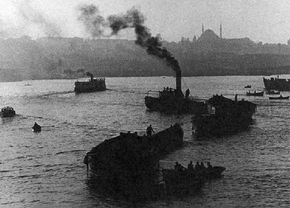 渡轮的引擎声像我祖母的缝纫机,接近码头时突然中断。窗户停止抖动,金角湾平静的海水,提着五十个篮子和公鸡母鸡上船的老太婆,希腊旧区的窄街,后方的小工厂和仓库、桶子、旧车胎、在城里漫游的马车,这一切看上去就像百年前精心描绘的黑白明信片。渡轮离开岸边,窗户又开始抖动,我们朝对岸的墓园驶去,此时从船烟囱冒出的黑烟让景色笼罩在忧伤中,看上去更像一幅画。有时天空似乎黑沉沉的,而后,就像影片的某一角忽然冒出红光,寒冷的雪光突然出现。