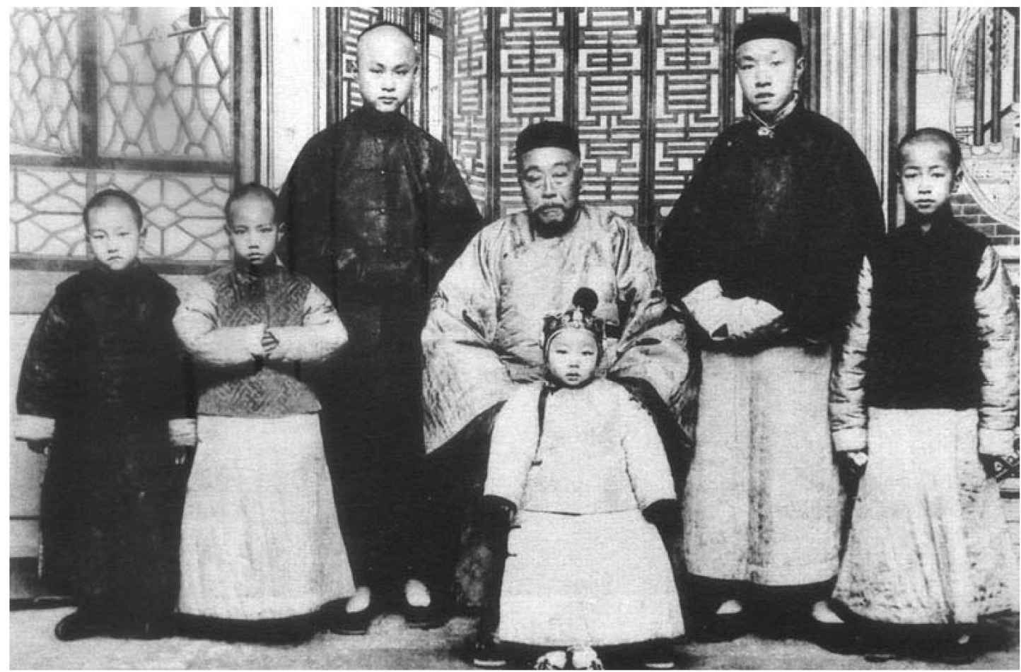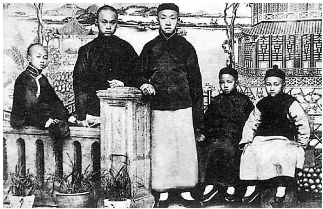 陈门一家。中坐者为陈宝箴,前立者为陈封可。后排左起:陈方恪、陈寅恪、陈覃恪、陈衡恪、陈隆恪(摘自陈小从《图说义宁陈氏》)