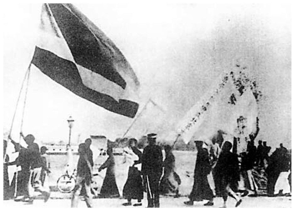 1919年5月4日,北京大学示威游行队伍向天安门进发,前方手举大旗者为傅斯年