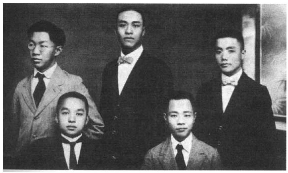 1920年秋,北京大学赴美同学留影。左起:罗家伦、康白情、段锡朋、汪敬熙、周炳琳