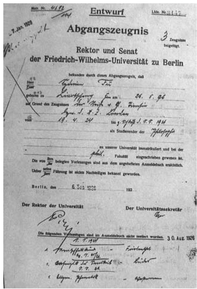 傅斯年1926年9月间离开柏林大学的证明书。其中提到他于1896年5月26日出生于中国聊城(按:傅斯年正确的生日是3月26日),在柏林大学读到1926年夏季学期为止,是作为哲学学生。其中提到傅先生修过,但在上课册中未被证明的课有人类学、梵文文法、普通语音学。梵文文法课的老师Luders是梵文泰斗,也是陈寅恪的老师。这份文件中注明普鲁士州教育部通知大学允许傅先生入大学的日期是1923年3月10日(证明书原件由台湾“中研院”副院长王汎森提供并说明)