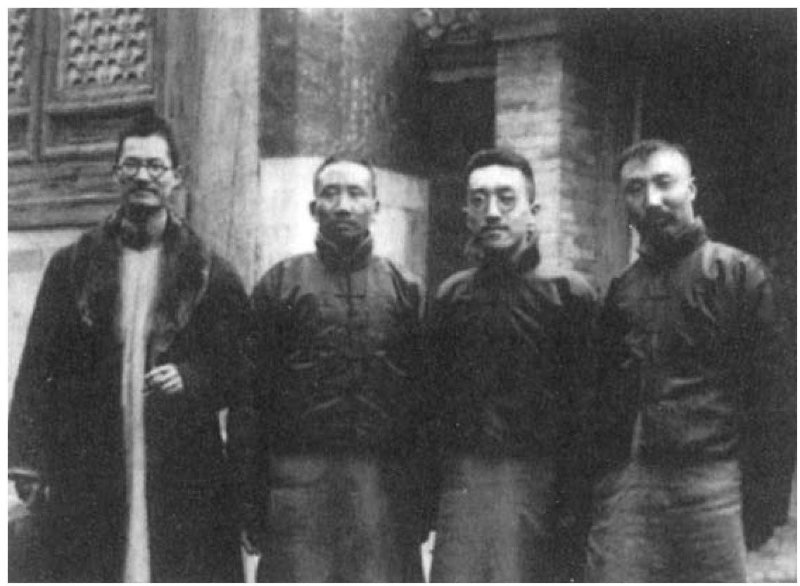 自左至右:蒋梦麟、蔡元培、胡适、李大钊。1920年3月14日于北京西山卧佛寺留影