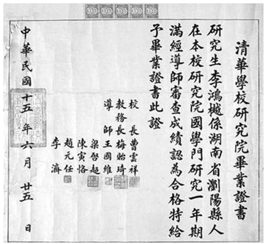 清华学校国学研究院毕业证书,此为李济作为五位导师之一的“铁证”