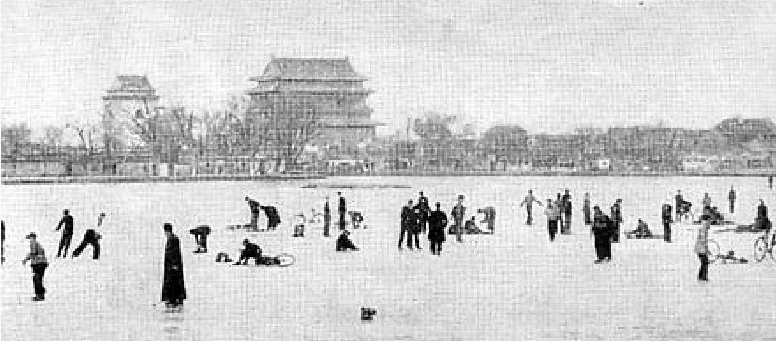民国初年早春,北京市民在结冰的湖上滑冰、玩自行车。背景是钟鼓楼