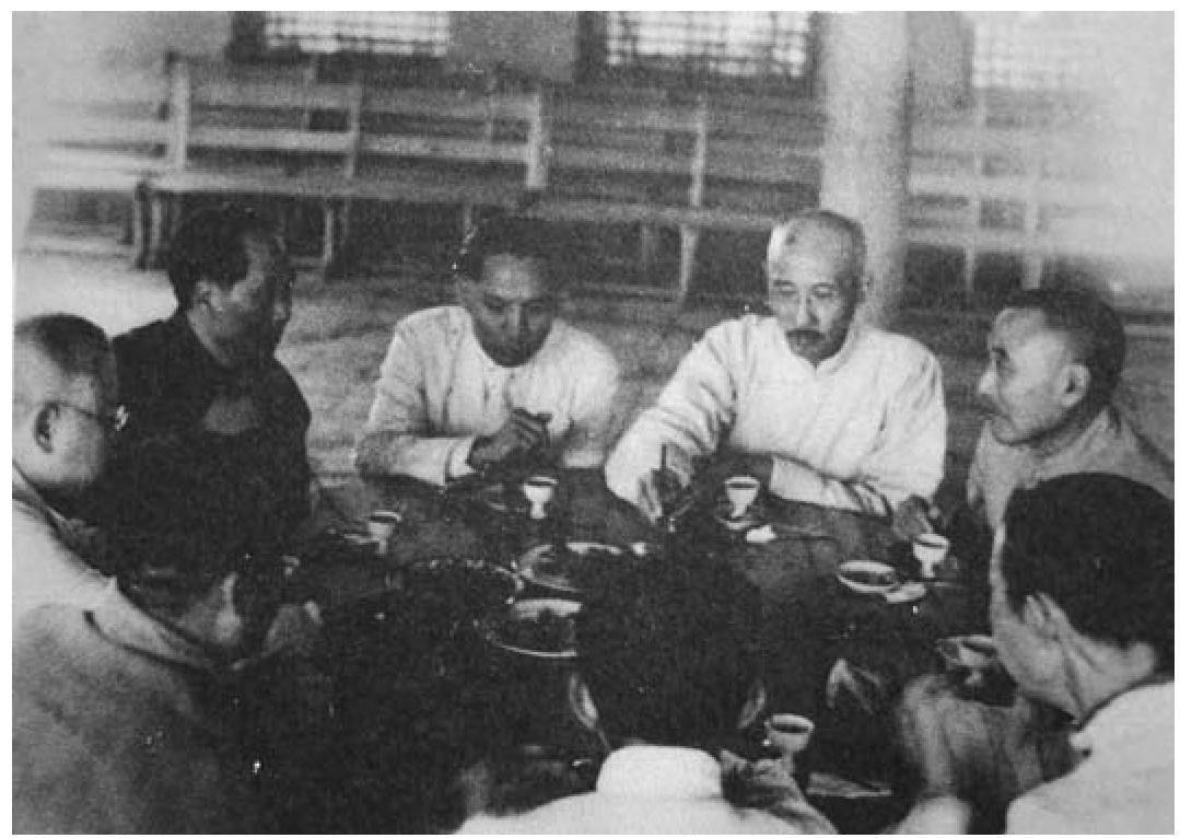 六参政员访延安时中共宴请照片,左一为毛泽东,毛的旁边、侧背对镜头者为傅斯年